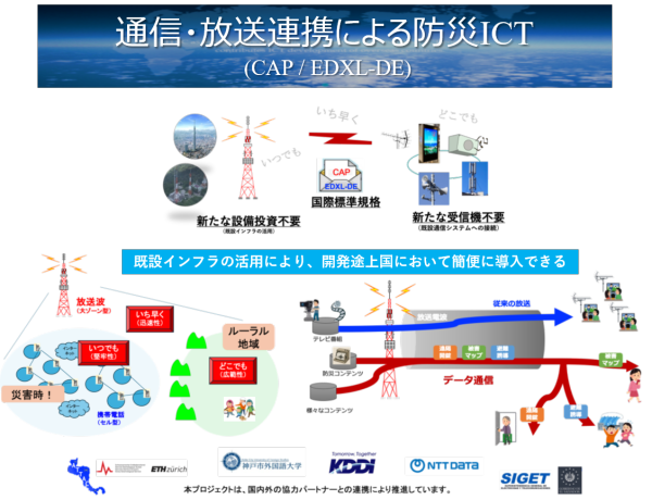 ICT Solutions for Disaster Management by Integrating Broadcast and Data Communications Technologies (CAP/EDXL-DE) In recent years, natural disasters have been increasing worldwide. For developing countries, in particular, the introduction of disaster prevention systems that transmit emergency information to the general public has become an important issue. Based on many years of local needs surveys, JTEC is launching solutions that link communication and broadcasting, and is working on system development and support for local implementation. JTEC has developed a prototype of… -